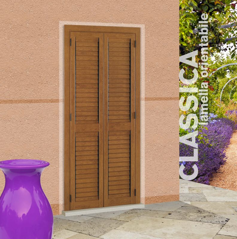 Anta e telaio in battuta (aletta da 75 mm)Vista internaGancio superiore per spagnoletta di chiusura*Gancio inferiore per spagnoletta di chiusura*Spagnoletta chiusura centrale*Lamella orientabile con movimento mini-crick (di serie)Aletta telaio da 75 mm (optional)